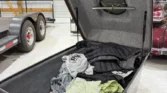 Spare tire stored under trailer floor